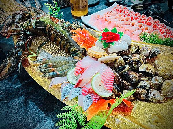 海鮮有大龍蝦1隻、汶萊甜白蝦8隻、鮮甜大蛤蠣18oz、鯛魚4oz、花枝漿3oz、極鮮海鱸魚4oz、帆立貝2顆