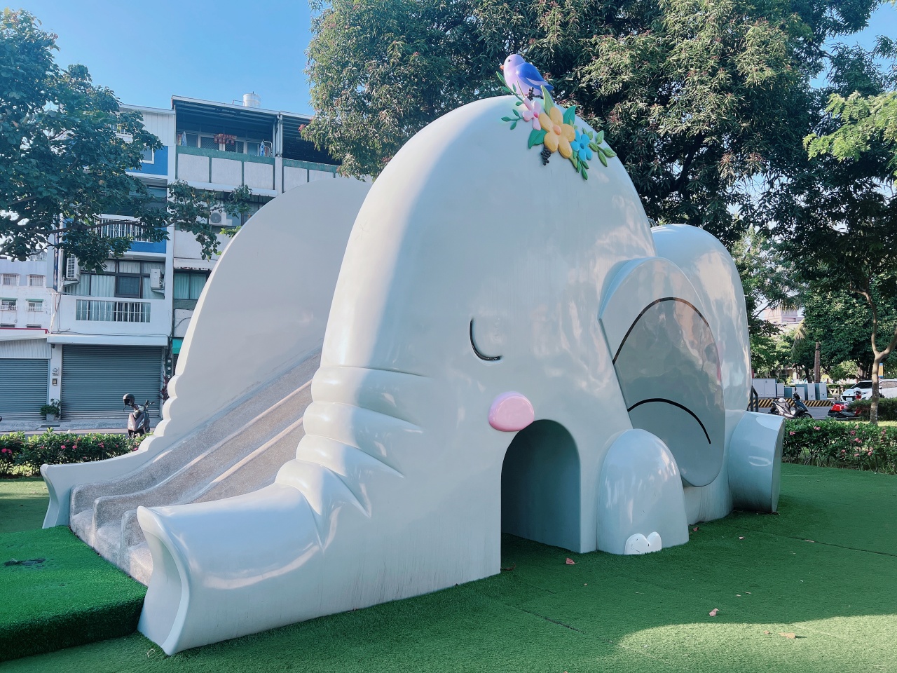 灰色大象配上粉嫩的腮紅和小花,可愛爆擊!磨石子滑梯超級咕溜好玩~