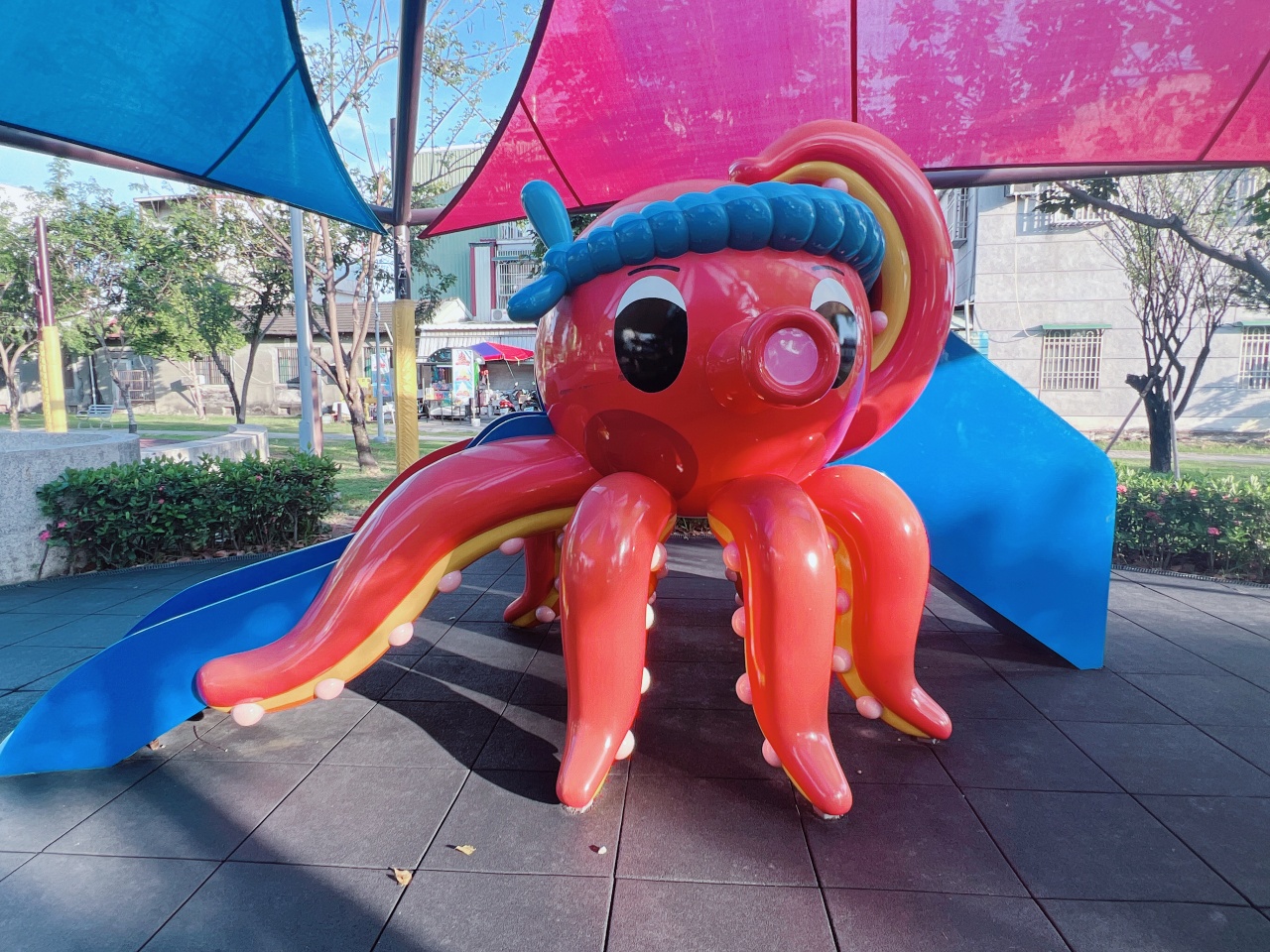 另一區還有鱷魚跟章魚滑梯,這區挑戰度更適合1~3歲的寶寶來玩,有遮陽超貼心!